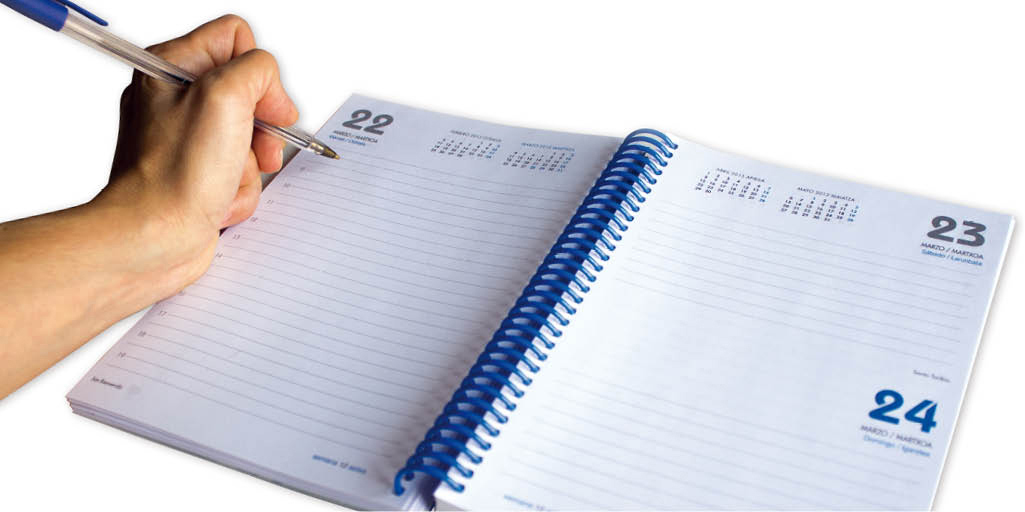 Páginas interiores día vista b/n, con portadas personalizadas a color y encuadernadas con espiral de PVC blanco, negro o transparente.