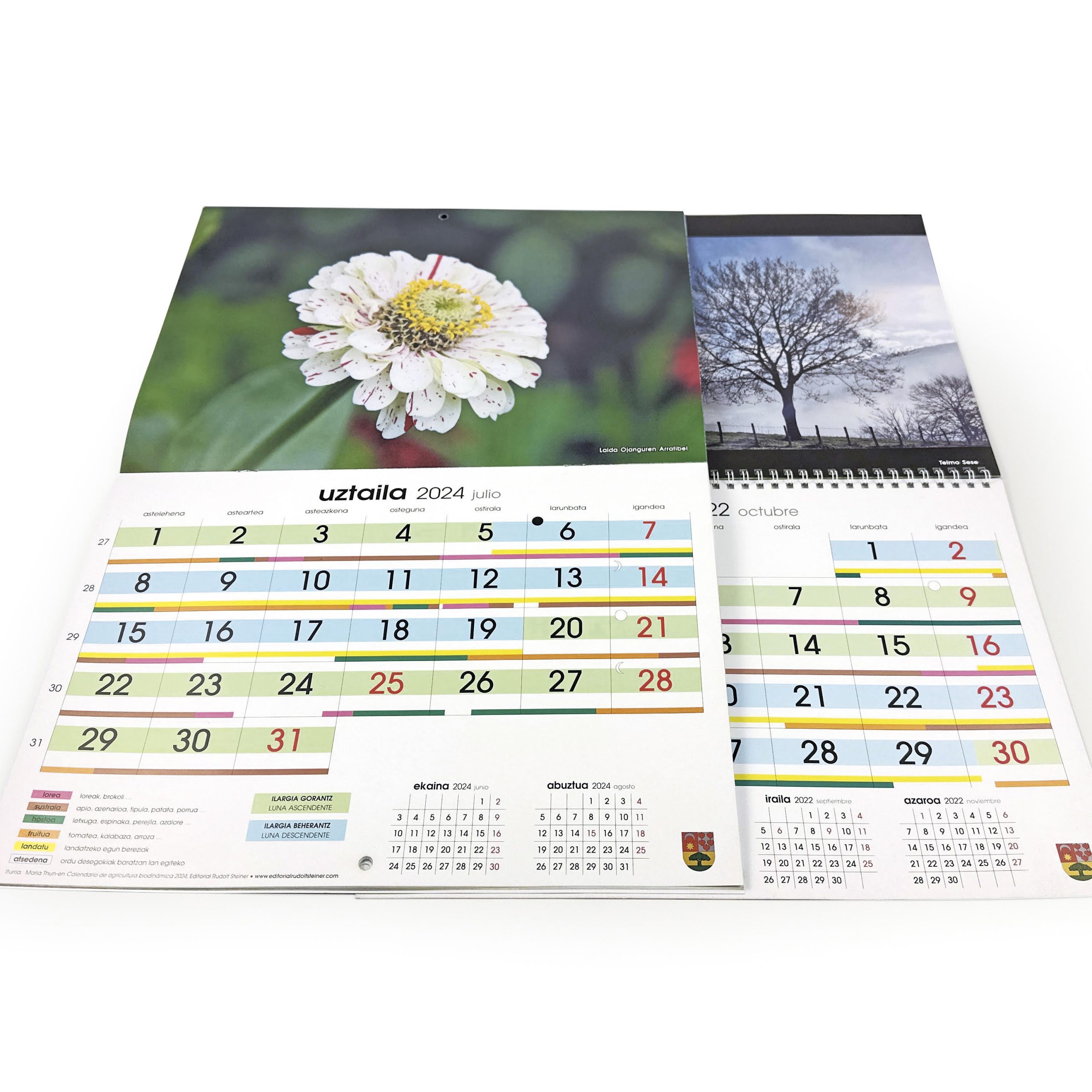 Calendarios de pared con 12 hojas de 200 gramos impresas a color por ambas caras, portada y contraportada a color plastificadas. Encuadernadas con grapa y con un taladro para colgar. Partiendo de archivos PDF.