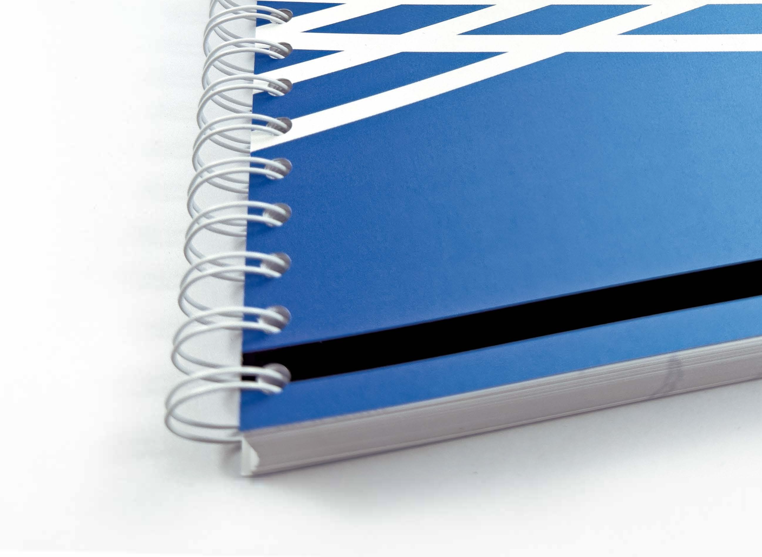 Cuadernos de 150 hojas de 90 gramos impresas a color por una cara, portada y contraportada de 330 gramos personalizadas. Encuadernadas con wire-o a color. Partiendo de archivos PDF.